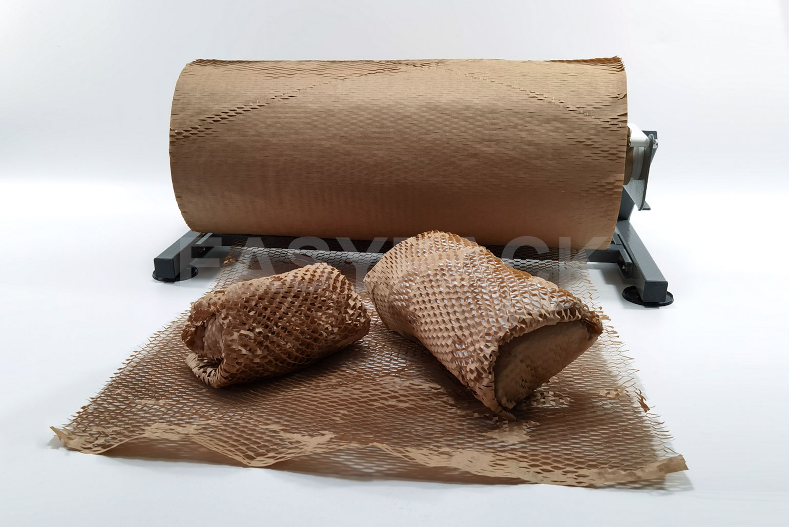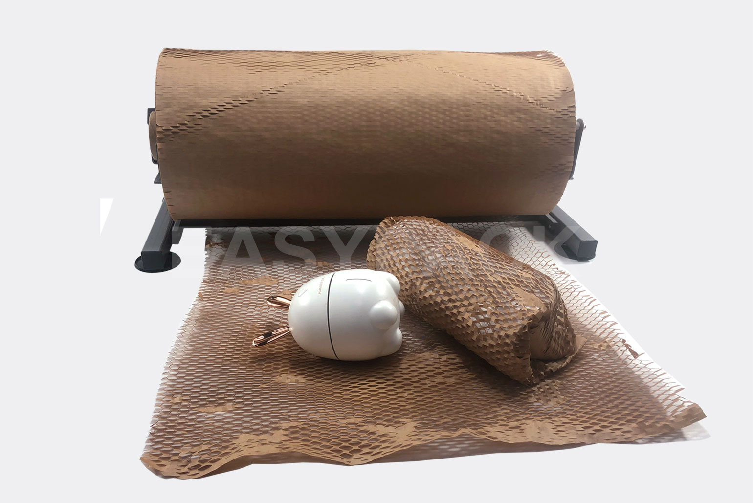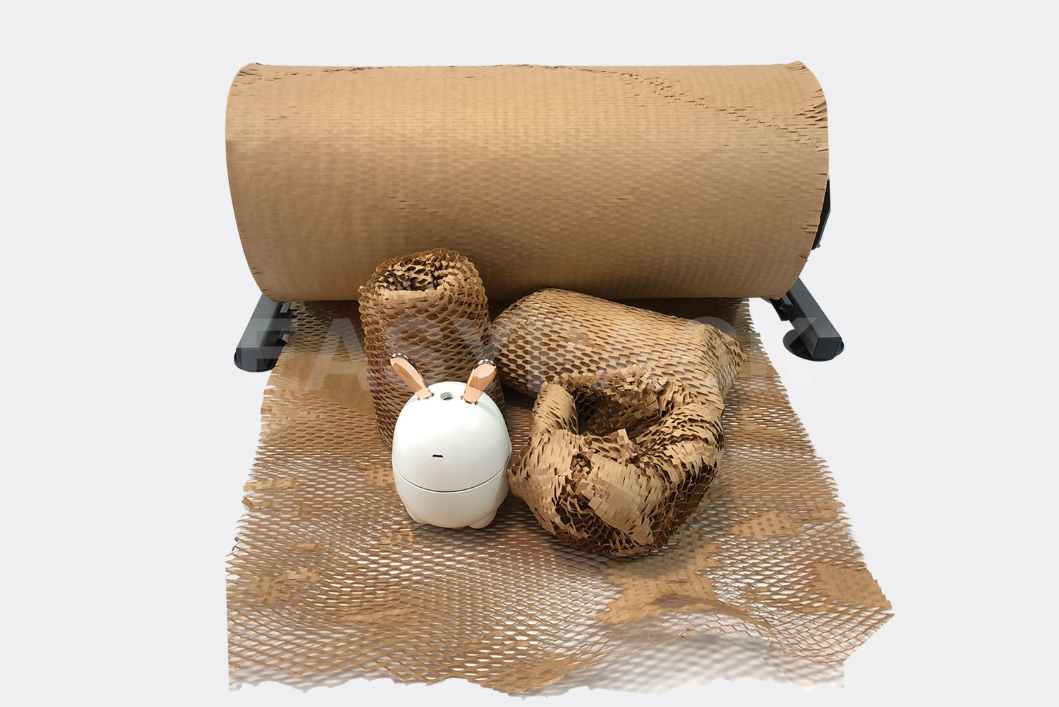 3D六角蜂窩狀的牛皮紙卷,經過拉伸后呈現立體蜂窩結構的紙襯墊,在包裹物品后能產生良好的緩沖防震效果。